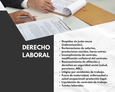Laboral: proteger tanto a trabajadores como a empleadores en conflictos laborales y de seguridad social, asegurando relaciones justas y legales.