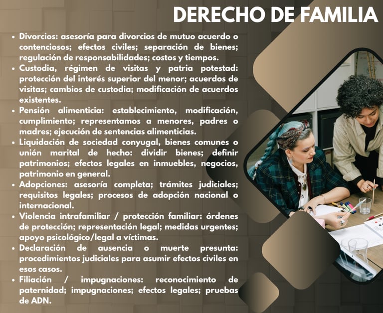 Familia: garantizar protección patrimonial y bienestar en procesos de divorcio, sucesión, custodia y alimentos.